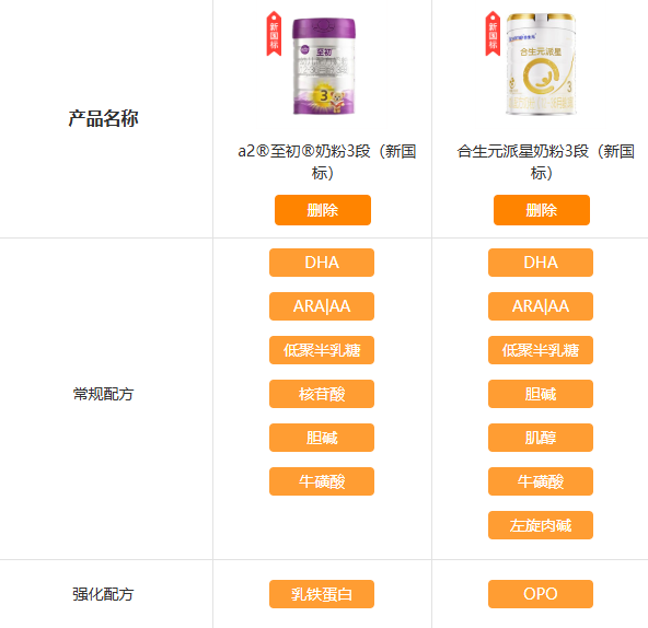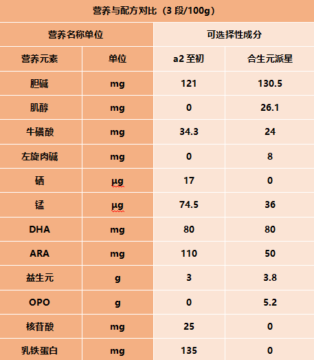 通过奶粉智库网的对比发现,在常规配方方面,a2至初比合生元派星多添加有核苷酸,合生元派星比a2至初多添加有肌醇和左旋肉碱;在强化配方方面,合生元派星比a2至初多添加有OPO,a2至初比合生元派星多添加有乳铁蛋白。详情如下图: