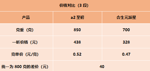 一听a2至初奶粉要比合生元派星的价格贵110元,但由于克重不同,统一为800g,a2至初要比合生元派星的价格贵40元。具体对比如下图:
