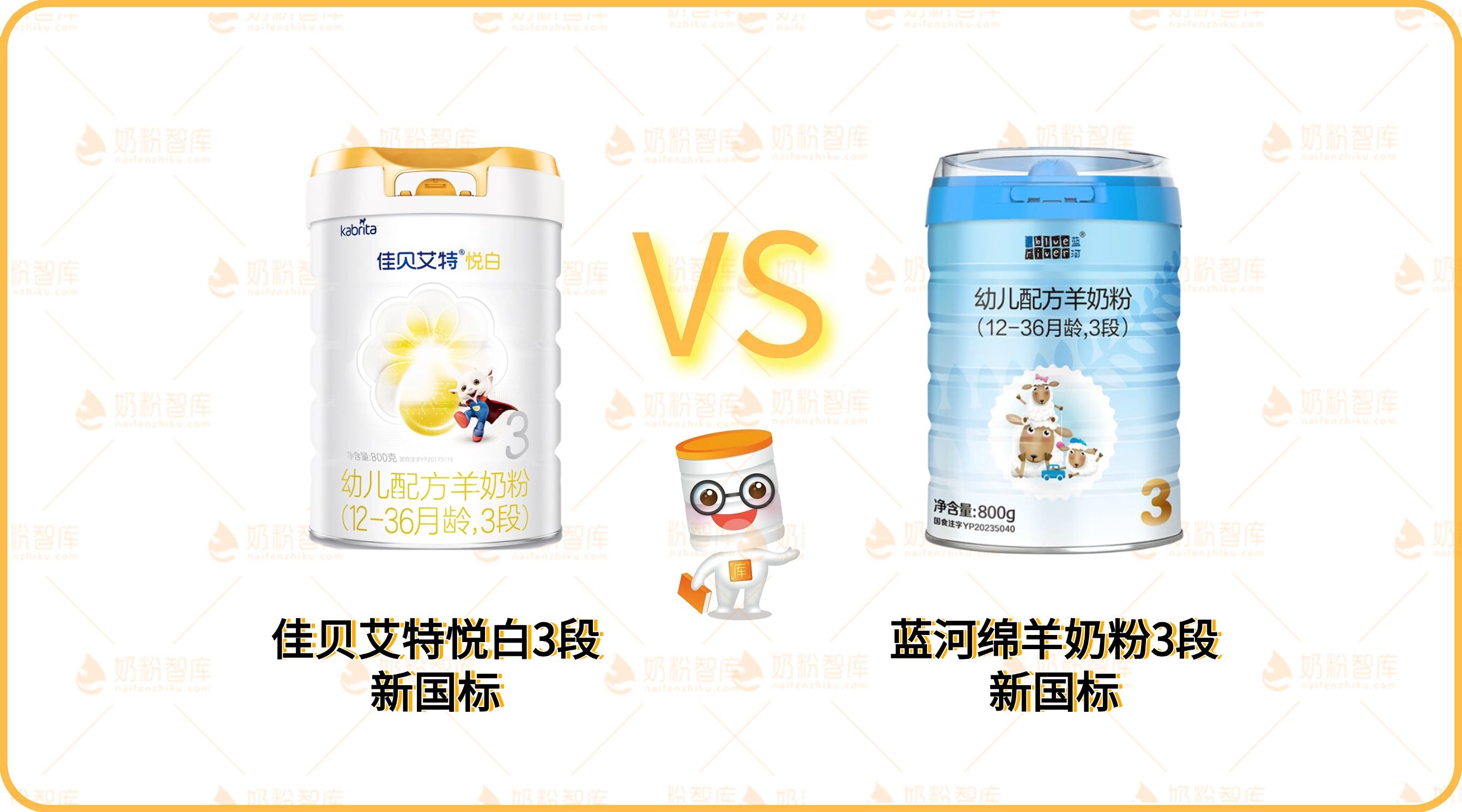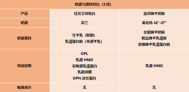 对比说明:奶粉对比主要从品牌背景、奶源与原料、营养与配方等方面展开,本次对比的产品为佳贝艾特悦白和蓝河绵羊奶粉,均以3段为例,下面均省略段位。