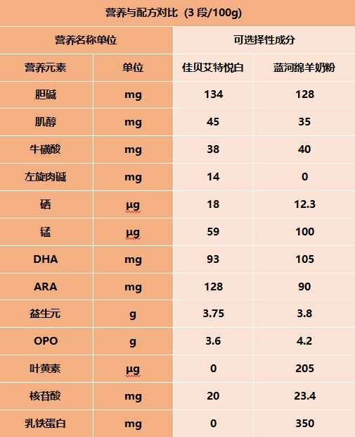 通过奶粉智库网的对比发现,在常规配方方面佳贝艾特悦白比蓝河绵羊奶粉多添加左旋肉碱;在强化配方方面蓝河绵羊奶粉比佳贝艾特悦白多添加有乳铁蛋白和叶黄素。详情如下图: