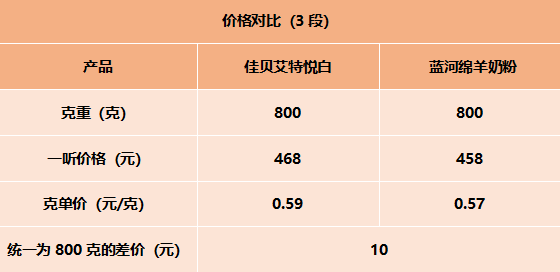 一听蓝河绵羊奶粉要比佳贝艾特悦白的价格便宜10元。具体对比如下图: